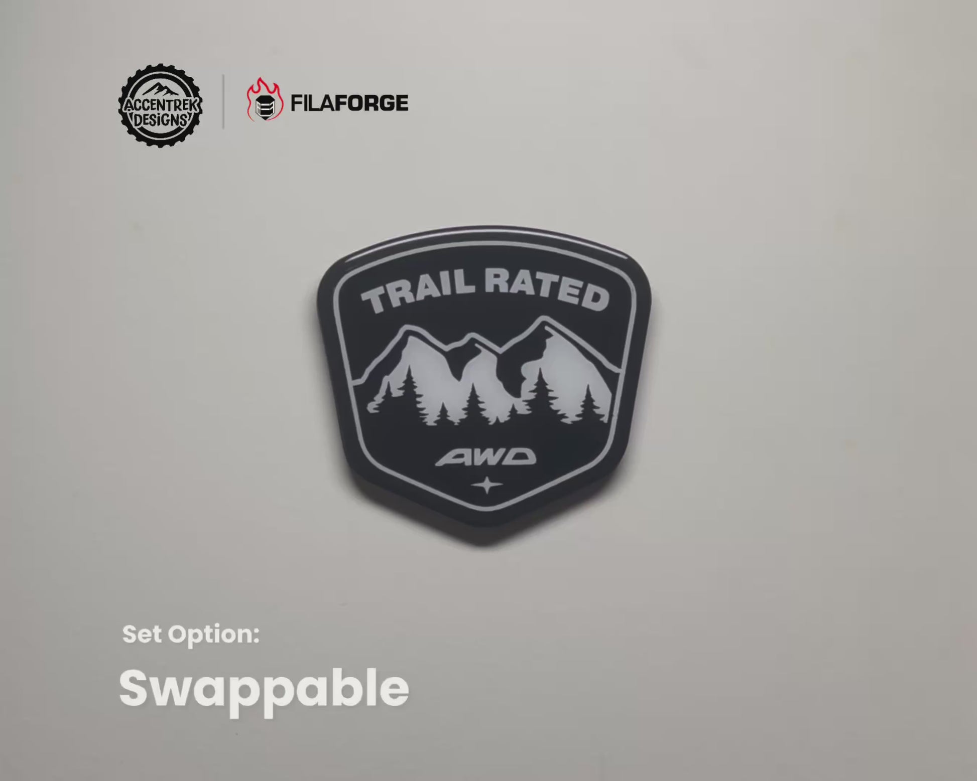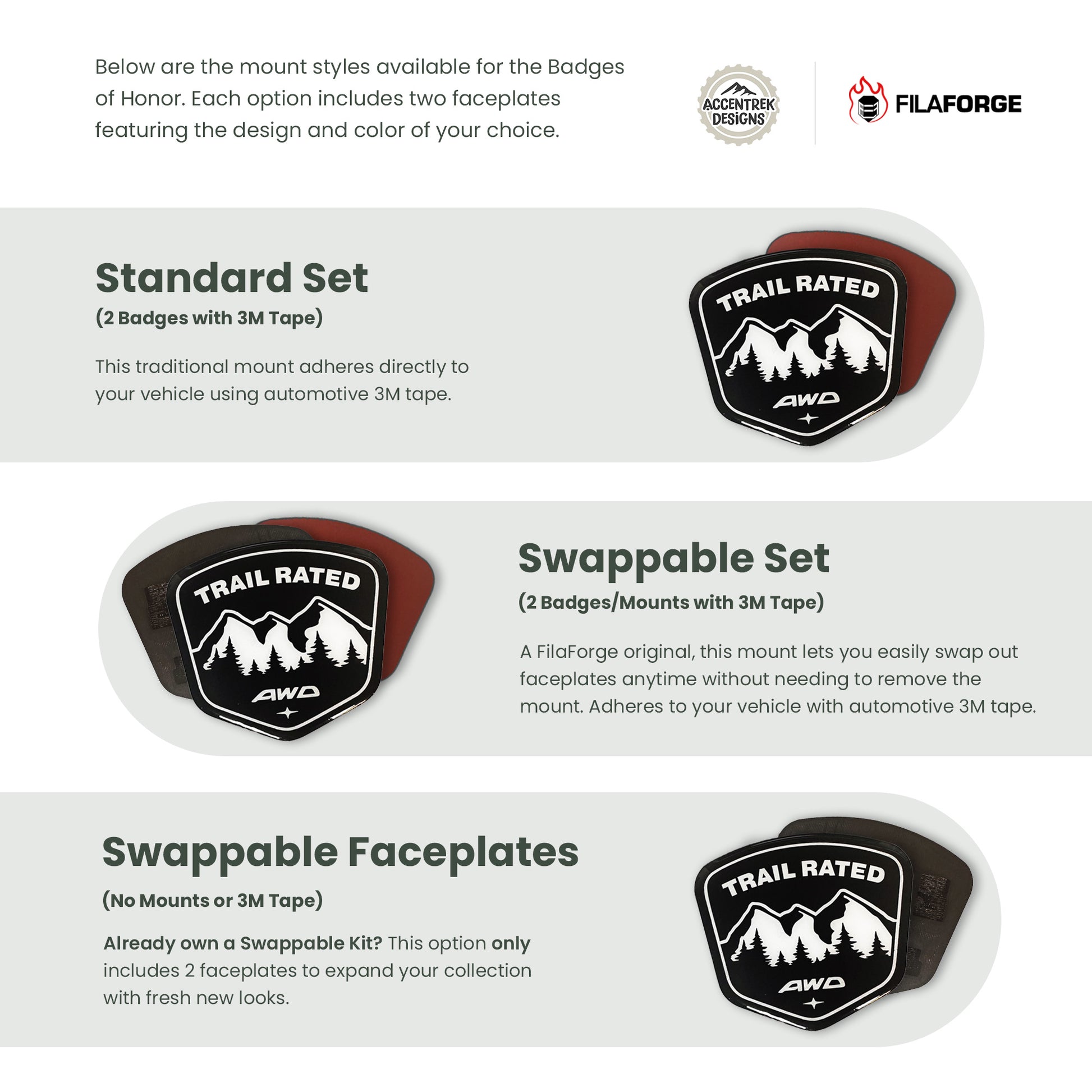 Swappable Set (Includes 2 Badges/Mounts with 3M Tape): A FilaForge original, this mount lets you easily swap out faceplates anytime without needing to remove the mount. Adheres to your vehicle with automotive 3M tape. See the video in product photos.